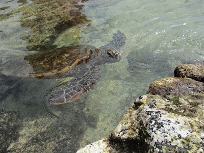 After surfing we went to turtle beach. This is a tiny little beach that not many people know about. There is a sign that says 'public shoreline access' but the get to the beach, you have to walk between these two houses on a sidewalk which many probably mistake as private property. Anyways, you walk down a little sidewalk and then cross over a bunch of lava rock to get to this little beach where a bunch of sea turtles come to hang out. The sea turtles did not disappoint. They were there, waiting for us. We saw three different turtles during our time there. They are really friendly and swim right up to you. Sea turtles have a special coat on there shell that keeps them healthy so we didn't touch them but they most certainly touched us with their legs while swimming around us!